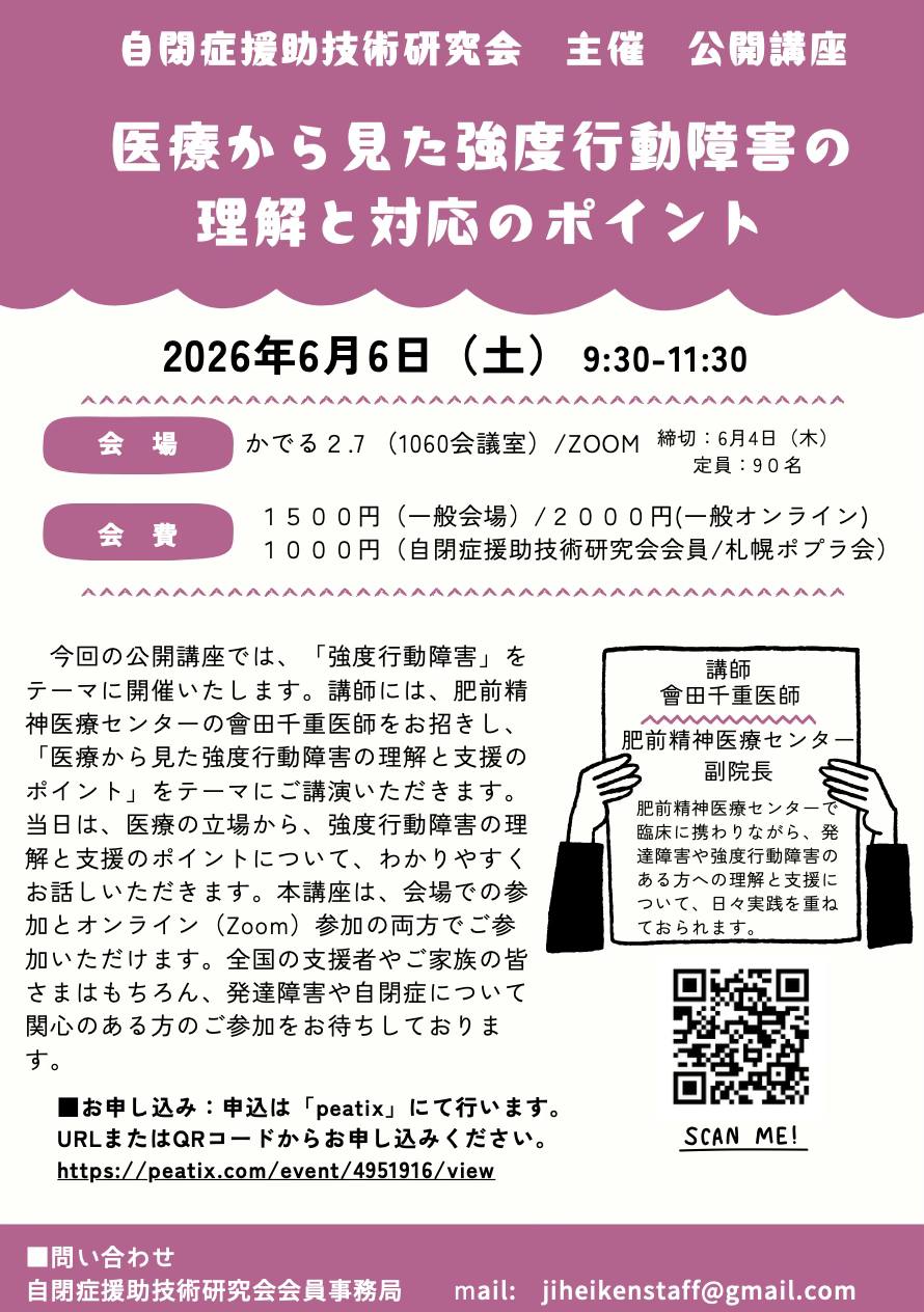 医療の立場から、強度行動障害の支援について、先駆的な取り組みをされている、會田先生のご講演です。ぜひご参加ください。 |